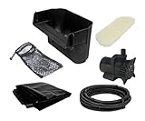 - Comes with 16 inch waterfall weir, 1,150 gph waterfall pump, 20 feet of one inch corrugated tubing, six foot by five foot piece PVC liner, mesh bag, filter foam