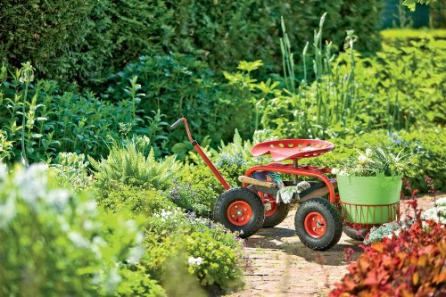 Gardening is easier when you can sit, swivel and roll! Our back-saving Gardener's Supply Tractor Scoot lets you work from a seated position virtually anywhere in your yard or garden. Now, thanks to your input, we've made this customer favorite even more comfortable and easier to use. First, we added a longer handle so you can pull the Scoot behind you like a wagon. When retracted, the handle locks upright to make a sturdy handhold. We also lowered the swiveling, tractor-style seat by 3-1/2" to give you better access when planting and harvesting, and the seat now adjusts from 16" to 19" high, to suit your body and the task at hand. Lastly, we increased the weight capacity of the 1" tubular steel frame to 400 pounds. Hefty, pneumatic tires ensure a smooth, stable ride. And now, our Scoot has a new bucket basket. It's the perfect size for a 5-gallon pail or our 3-1/2 gallon Tubtrug and provides a convenient place to toss weeds or gather the day's harvest.