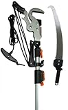 Trail Blazer Products 2-inch Jumbo Geared Tree Pruner. Unique vertical movement of the cutting blade is one of many features that set this lopper aside from the traditional pivoting blades. Provides a clean cutting action without the need for twisting or struggling to complete the cut or to free a stuck blade. A snap lock fastens the working head to the pole while a secondary clamp-lock keeps the extended pole in place. Added safety and stability features that will ensure the head and pole stay in place. The pulley and gear-action combination multiplies the pull exerted on the rope by around 20 times and the hidden roller guides keep the straight line movement of the blade and with a minimum of friction. With this force, the tree lopper is able to shear up to 2-Inch of green wood with relative ease. Includes an Interchangeable, 14-inch, High Carbon, Stainless Steel Saw Blade